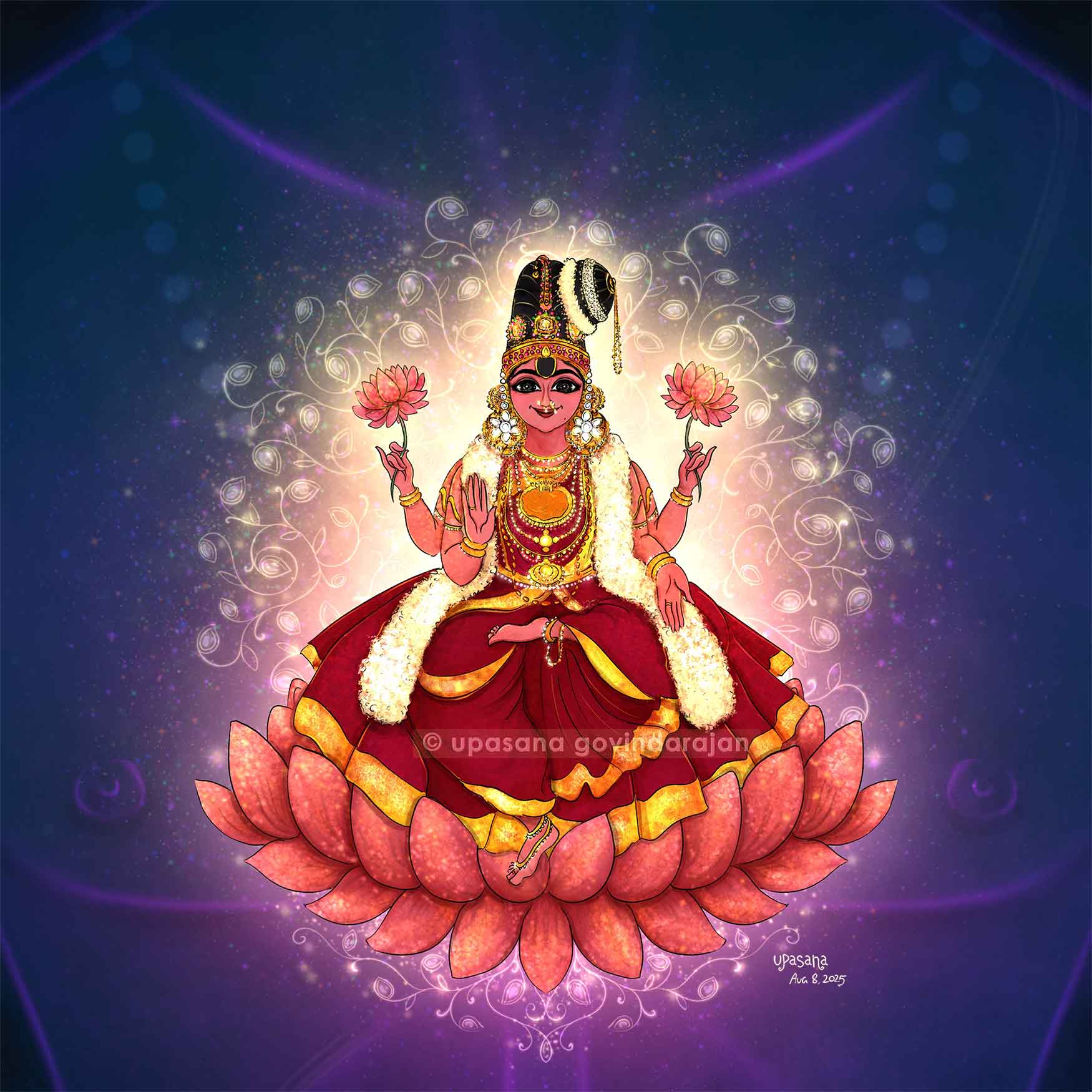 Inspiration from the Guna Ratna Kosam by Swami Parashara Bhattar, in which he elaborates the various gunas (attributes, qualities) of Sri Ranganayaki Thayar of Srirangam. He describes her as "Sriranga dhama mani manjari", the gem-studded crest jewel of Srirangam, always in the very heart of Sri Ranganatha.